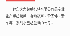 Introduction保定大力起重機械有限公司是專業生產手拉葫蘆、電動葫蘆、緊固件、滑車等一系列小型起重機械的公司。